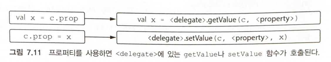 // 이 프로퍼티 위임 코드는 class C { var prop: Type by MyDelegate() } // 다음과 같이 컴파일 된다. class C { private val <delegate> = MyDelegate() var prop: Type get() = <delegate>.getValue(this, <property>) set(value: Type) = <delegate>.setValue(this, <property>, value) }
