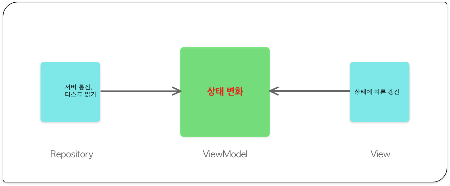 ViewModel은 이렇게만 하면 됩니다. MVVM에서는 View가 알아서 ViewModel의 상태를 염탐하고, 화면을 최신 상태를 유지할 겁니다.