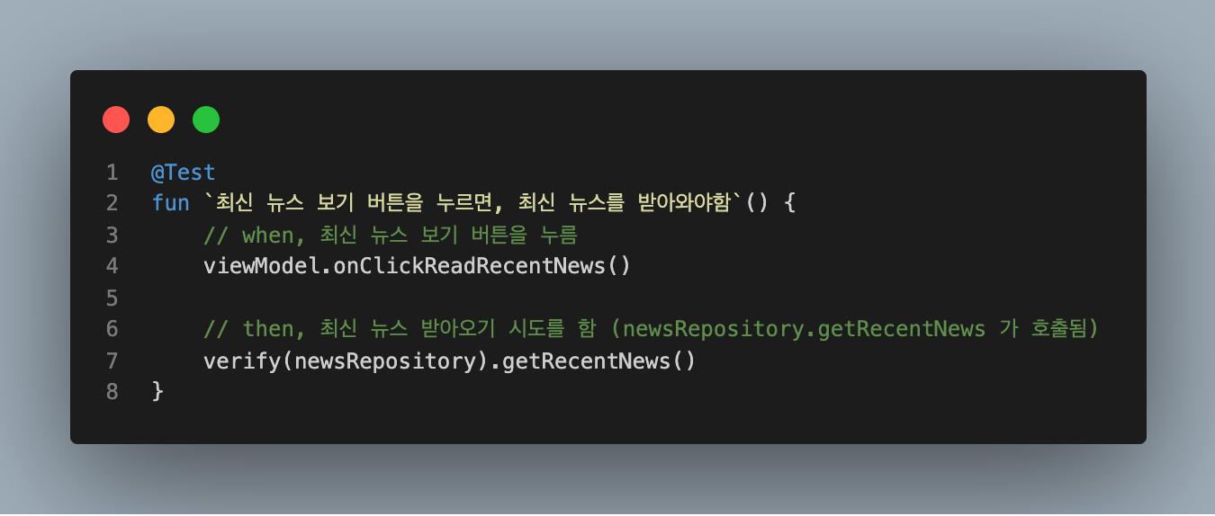 newsRepository의 getRecentNews라는 함수가 호출 됐는지 검증하는 코드입니다.