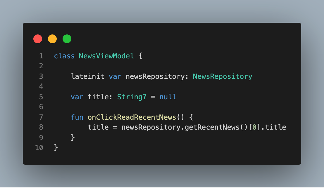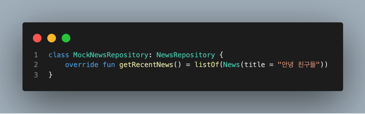우리가 테스트를 작성할 관심 객체는 NewsViewModel이죠? 그 이외의 외부 객체로는 NewsRepository가 있네요.